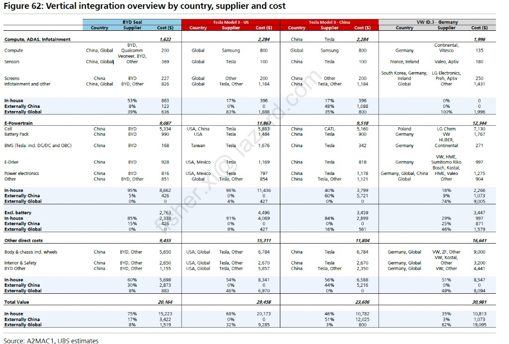 瑞銀指出,比亞迪表現出高度的垂直整合優勢,海豹汽車中大約 75% 的零部件是比亞迪自產,留給全球傳統供應商的空間是相對比較小的,大量依賴中國的本土供應鏈,海豹汽車零部件的自制比率要比特斯拉在美國生產、在中國生產或者大眾在德國生產更高: