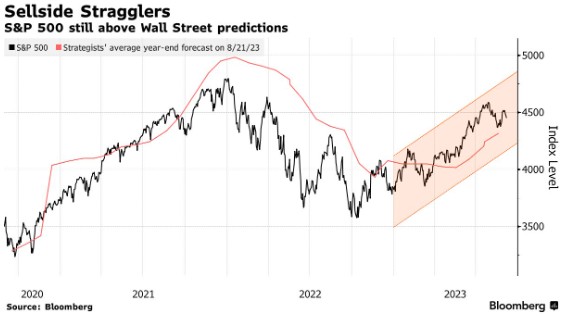 根據數據,在今年 7 月的峯值,標準普爾 500 指數超過華爾街平均年終目標的幅度是自 2020 年 9 月以來最大的。這一出人意料的進步——以及更為樂觀的前景——導致一波策略師上調了對標普指數的預測。
