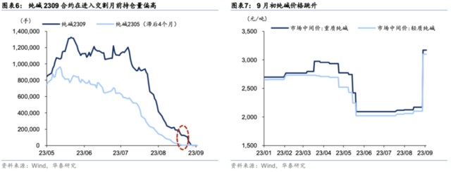 第三、九月合約接近交割,部分品種可能存在逼倉現象。逼倉是指交易一方利用資金優勢或倉單優勢,主導市場行情單邊運動,導致另一方不斷虧損,最終不得不斬倉的交易行為。低庫存是多頭逼倉空頭的必要不充分條件,低庫存增加了空頭找到現貨進行交割的難度,只能被迫以較高價格平掉倉位。以漲幅較大的純鹼為例,2309 合約在進入 8 月下旬時持倉量仍超過 20 萬手,而作為對比,2305 合約在進入交割月前的持倉量早已降至低位。此外,純鹼現貨價格在 9 月初(交割月)大幅跳升,也是印證了該品種可能存在逼倉。