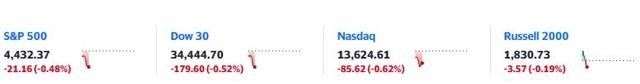 美股低開低走,開盤近一小時,道指跌幅擴大至 180 點,與標普 500 指數大盤均跌 0.5%,科技股居多的納指跌 0.6% 跌幅居前,昨日領跌的羅素小盤股跌 0.2%。