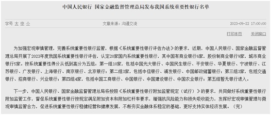 為加強宏觀審慎管理,完善系統重要性銀行監管,根據《系統重要性銀行評估辦法》(下稱《評估辦法》)的要求,近期,中國人民銀行、國家金融監督管理總局開展了 2023 年度我國系統重要性銀行評估,認定 20 家國內系統重要性銀行。