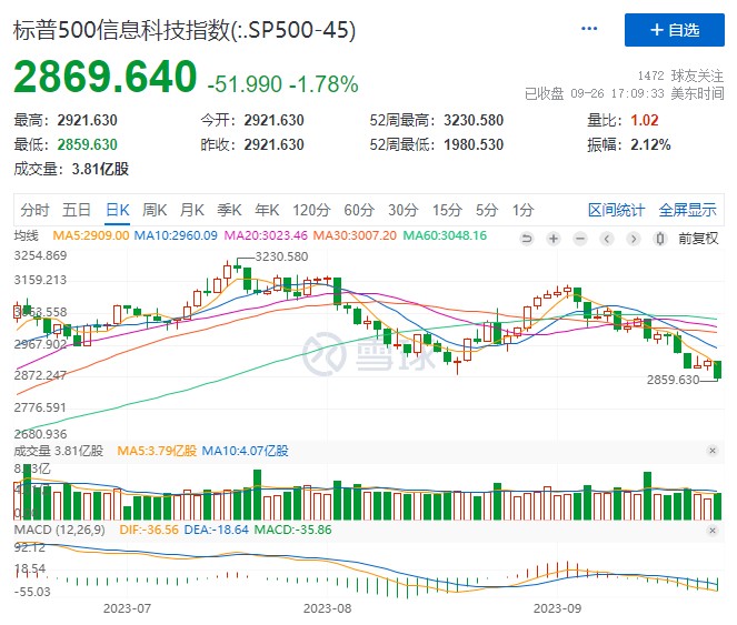 週二,標普 500 信息科技指數週二下跌 1.8%,跌幅從 7 月高點擴大至 11%,10 年期美債收益率徘徊在 2007 年以來的最高水平附近。標普 500 指數下跌 1.5%。