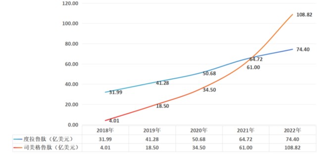 顯著的療效,加上兩大超級大市場,讓 GLP-1 藥物的銷售額不斷刷新人們的預期。2022 年全球已獲批上市 GLP-1 藥物整體銷售規模已達 225 億美元規模以上,其中司美格魯肽、度拉糖肽銷售額分別達 108.82 億美元、74.4 億美元。