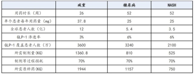 根據安信證券研究中心測算,GLP-1 藥物原料藥在減重、糖尿病、NASH 領域的最低需求分別為 1944KG、1157KG、750KG。以國外某一供應商司美格魯肽 API 報價 5000 元/克計算,市場規模接近 200 億元。