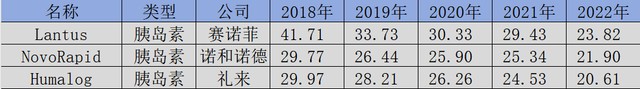 其中,GLP-1 受體激動劑最為引入矚目,司美格魯肽、度拉魯肽均是去年全球銷售額前 20 的明星藥物。作為革命性的降糖藥產品,隨着周製劑產品的上市,未來有望取代胰島素成為糖尿病治療的主線藥物,全球出貨量最大的三款胰島素產品,均在過去五年受到嚴重衝擊,營收規模大幅下滑。
