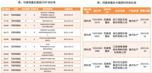 從目前原料藥的激活備案企業數量來看,胸腺五肽、生長抑素、醋酸奧曲肽等品種的原料藥企業分別為 55 家、19 家、19 家,競爭十分激烈;而司美格魯肽、利拉魯肽等高難度的高端產品,國內合格的原料供應商更是僅為 4 家。