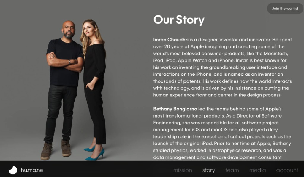 Humane 成立於 2018 年,由前蘋果設計和工程團隊 Imran Chaudhri 和 Bethany Bongiorno 創立,其中,Chaudhri 帶頭設計 iPhone 的主屏幕,Bongiorno 幫助領導了 iPhone、iPad 和後來的 Mac 的軟件開發。