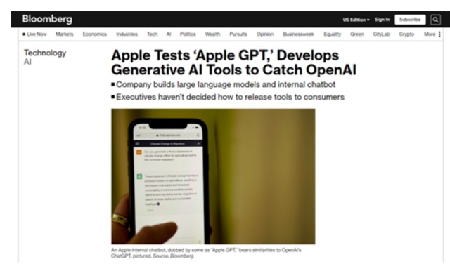 隨後在 7 月 20 日,彭博社爆料,蘋果正在內部開發類 ChatGPT 的產品,與微軟、OpenAI、谷歌、Meta 等科技巨頭在生成式 AI 賽道展開激烈競爭。