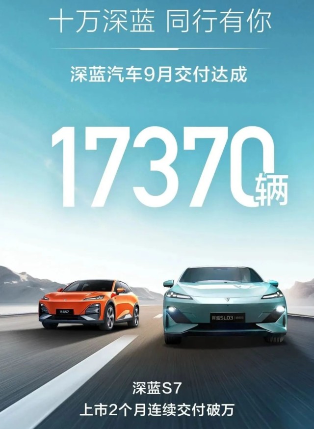 依靠 S7 與 SL03 兩款車型,深藍 9 月交付 1.74 萬輛新車,環比增長 17.87%,上月交付數據為 14736 輛。