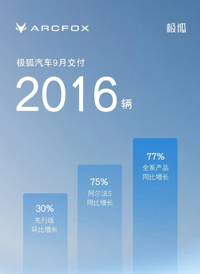 9 月份,極狐共交付 2016 輛新車,上月交付數據為 1868 輛,交付數據有所上升。