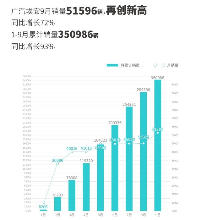 9 月份,廣汽埃安共售出 5.16 萬輛新車,同比增長 72%,環比增長 14.58%,單月銷量數據再創新高。