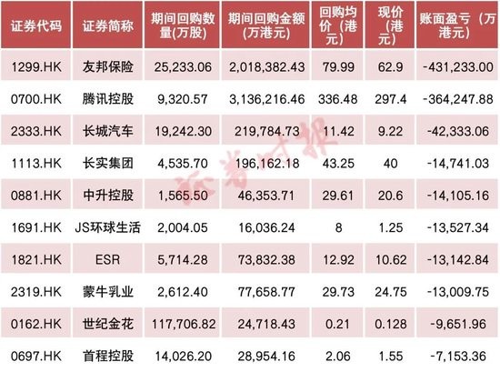 不過,記者統計顯示,整體來看,156 家出手回購的公司 “虧多賺少”,僅有 41 家回購均價低於現價。其中,賬面虧損最多的是友邦保險,回購均價是 80 港元,現價 62.9 港元,賬面虧損 43 億港元;其次是騰訊,賬面虧損 36.4 億港元;的回購賬面虧損 4.2 億港元;的回購賬面虧損 1.5 億港元。