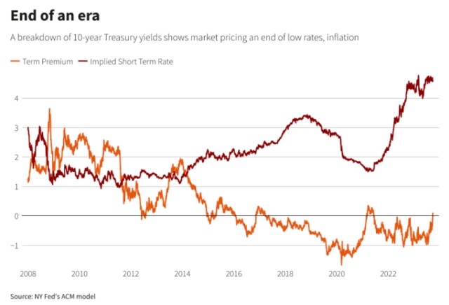 美債期限溢價趨於轉正,成為近期長端美債利率的拉動項。投資者正在押注,自 2008 年金融危機開始的低利率和通脹時代已經結束。