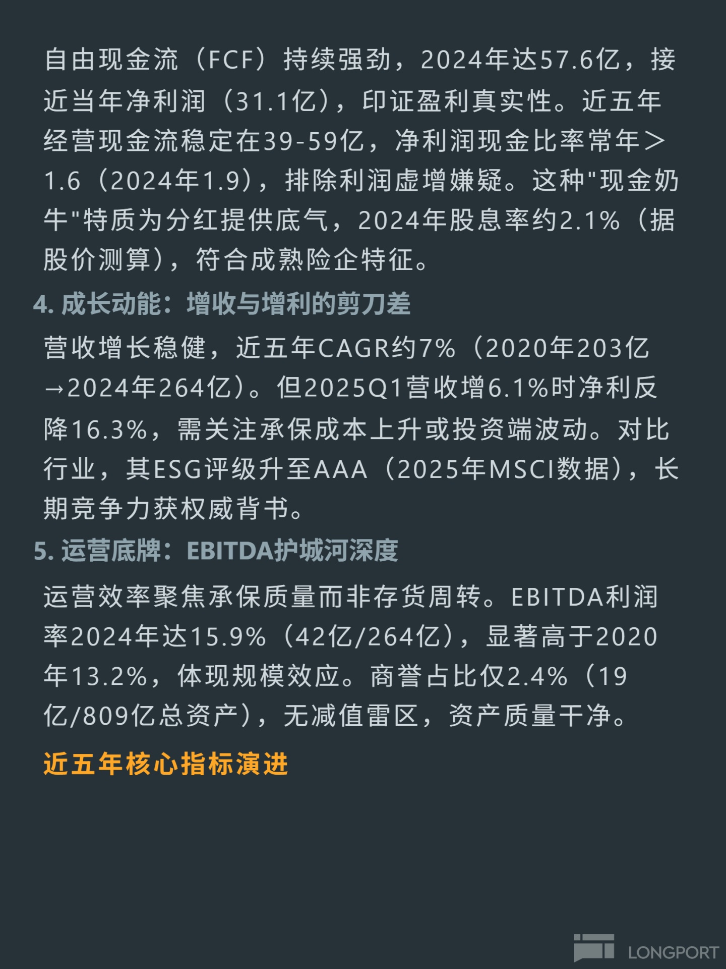 📈 Financial highlights: ROE reached 19.58% in 2024 (far exceeding industry 8%-12%), with 5-year revenue CAGR of 7% (2020: 20.3B → 2024: 26.4B). 2024 net margin 11.79%, free cash flow 5.76B (close to net profit 3.11B), current ratio 16.39x (float advantage), ESG rating AAA. But Q1 2025 revenue grew 6.1% while net profit fell 16.3%—need to monitor underwriting costs or investment-side volatility.