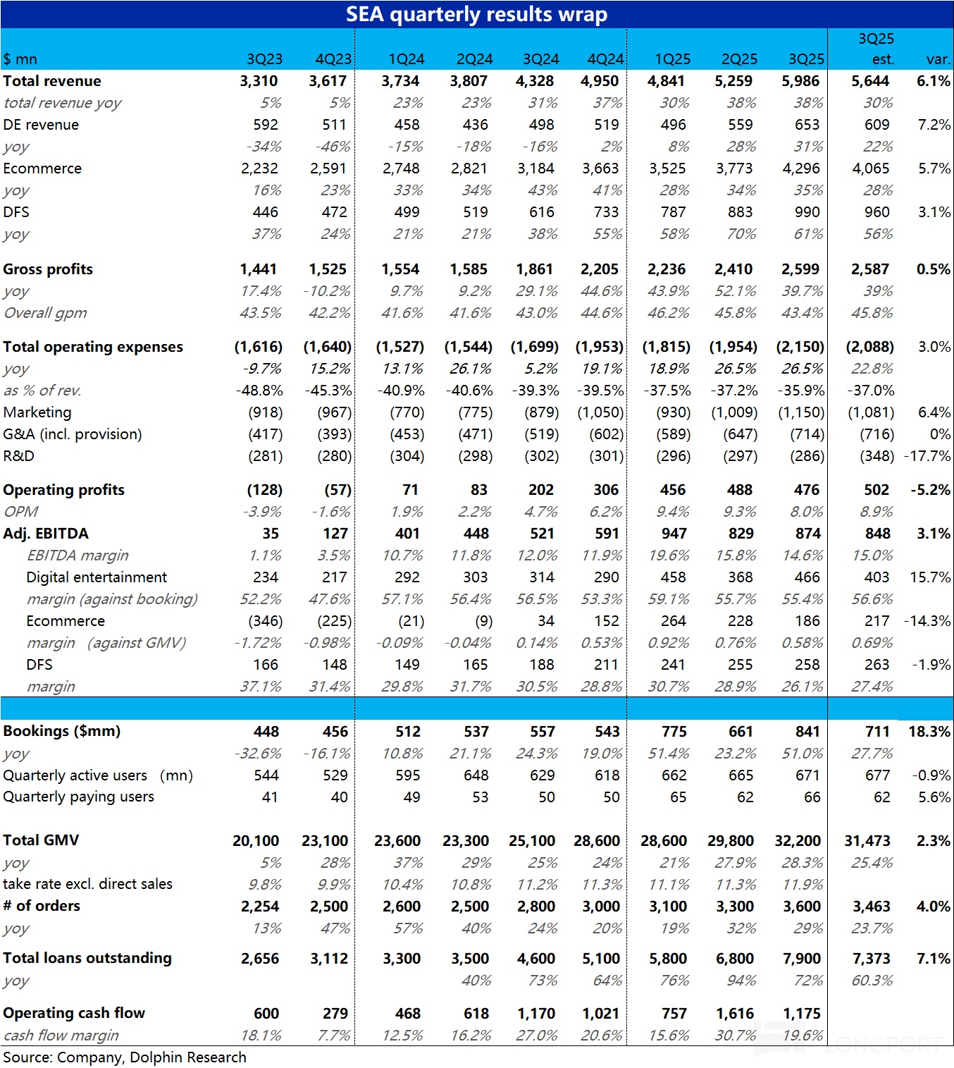 Due to the better-than-expected growth of the major segments mentioned above, Sea's overall revenue grew by 38% this quarter (maintaining last quarter's growth rate) reaching approximately $5.99 billion, significantly outperforming sell-side expectations by about 6 percentage points.