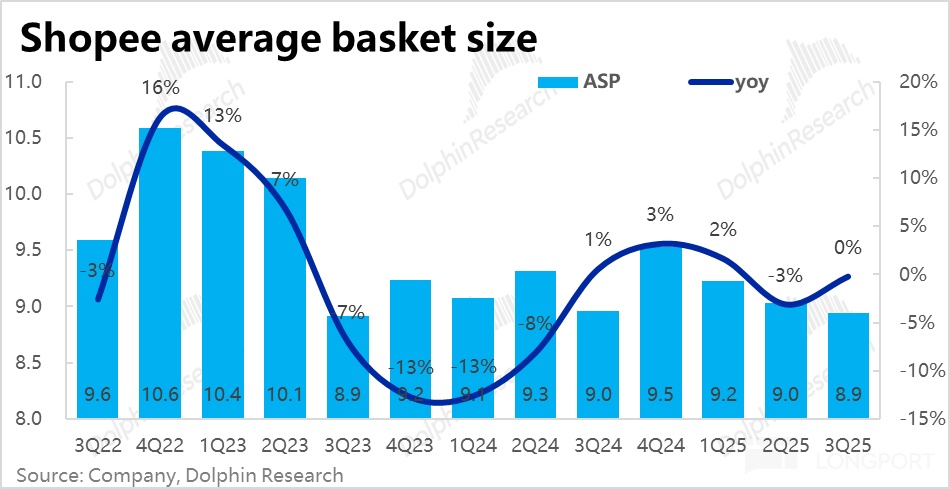 1. GMV remains strong, but not driven by volume: The most important Shopee e-commerce segment's GMV growth rate this quarter was still 28.3% year-on-year. It slightly accelerated compared to the previous quarter and exceeded the sell-side expectation of 25.4%, undoubtedly still quite strong.